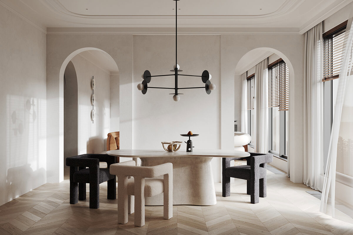 The focus on functionality leads to simple arrangements, preserving the natural irregularities and roughness of surfaces. Simple yet sturdy bowls and trays, along with indoor plants, add a touch of freshness to the space.